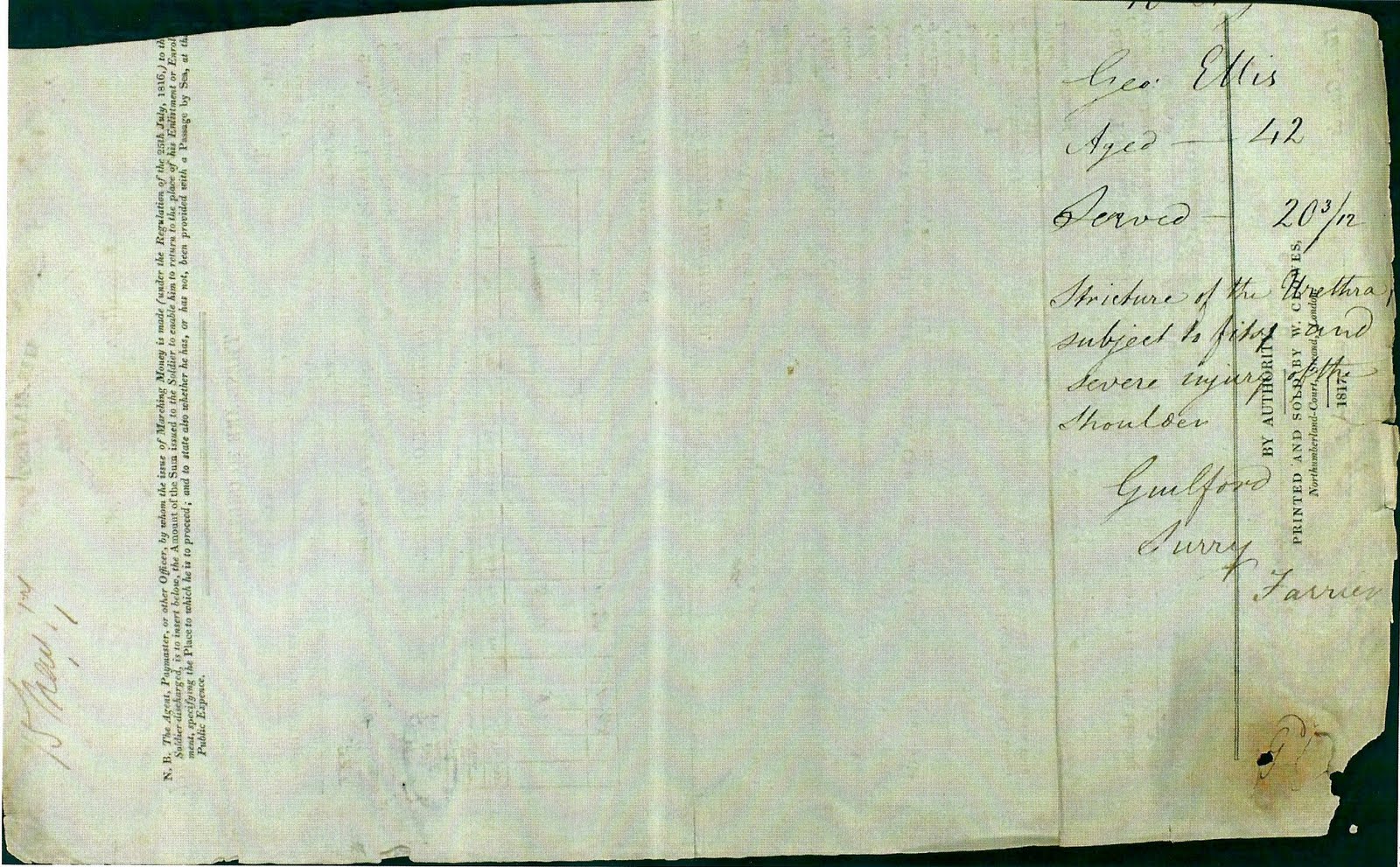Discharged in 1817 after serving 20 years and three months, injuries of