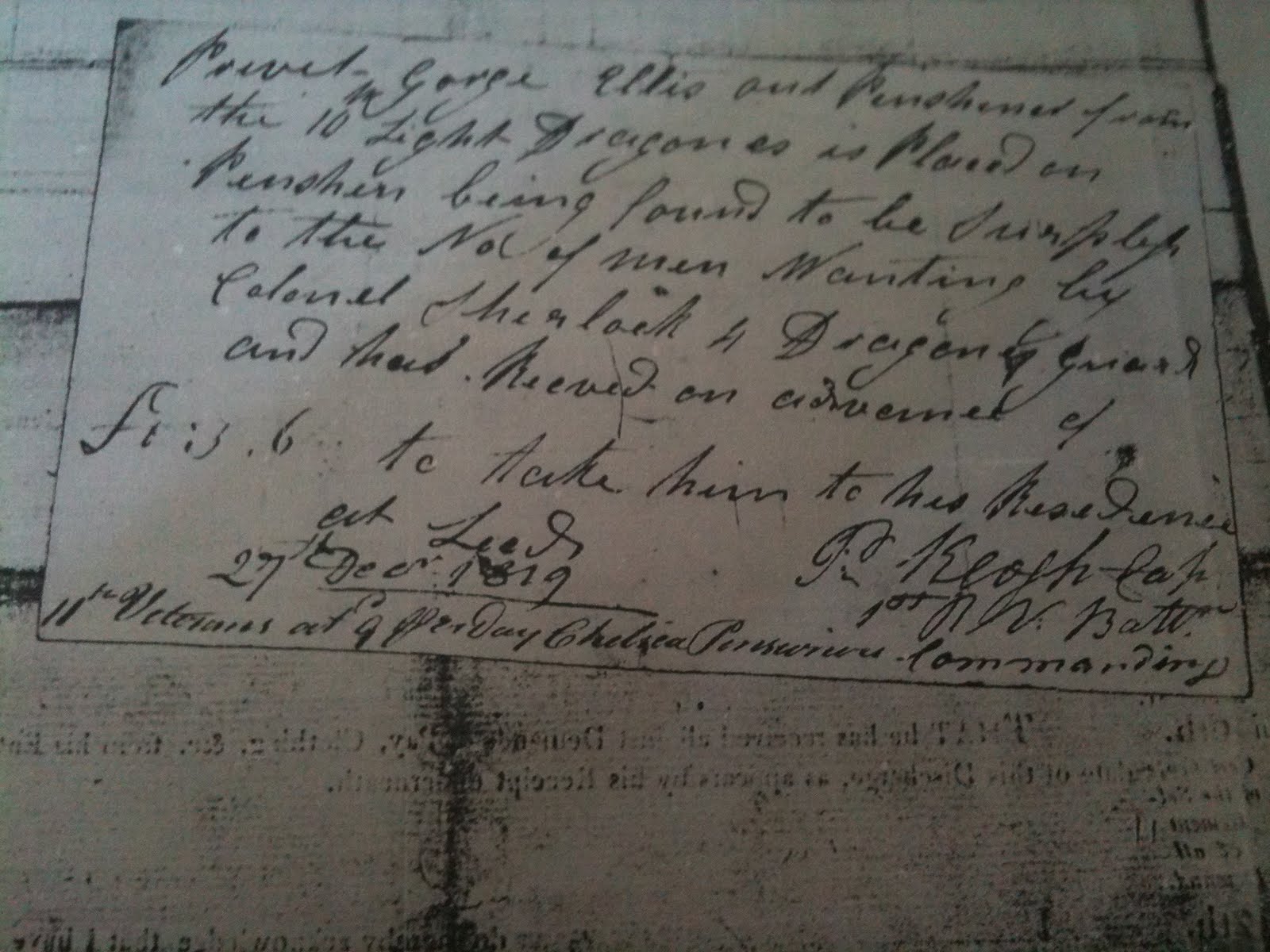 In the early part of 2010 I was searching The National Archives site and came across a reference to George Ellis, late of the 10th Light Dragoons in relation to a pension. When the document arrived I looked and for whatever reason didn’t spot that although this document relates to someone else there is an insert in relation to George. Here is the full document.