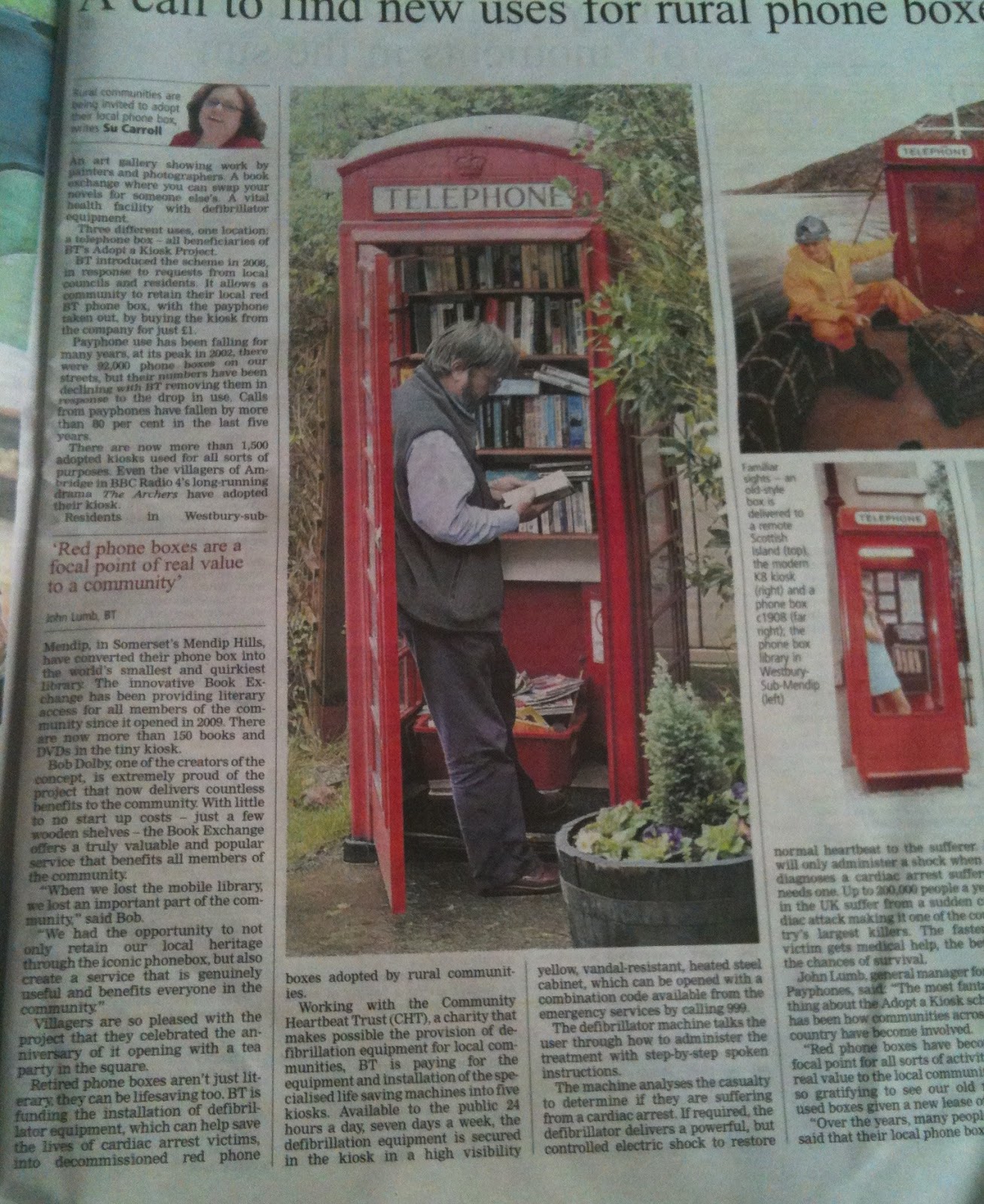 A simple pleasure for me is finding some time to read the local newspapers and enjoy some of the more wacky and interesting bits of news. Well, here is an article from the local regional newspaper from a few weeks ago. This article is looking at the new lease of life that the familiar UK phone boxes get. This is part of a scheme run by BT (British Telecom), called the Adopt a Kiosk Project. This particular phone box is in the Somerset parish of Westbury-sub-Mendip where it has been turned into a library.