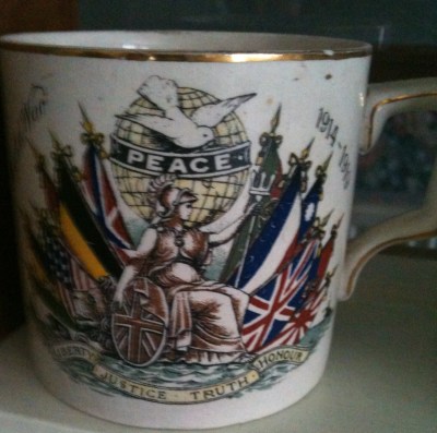 In view of the fact that we Commemorate Remembrance Day on Friday, I thought that I would share this delightful mug from the First World War with you. It sits on the picture window in our lounge and is the first mug on the left.
