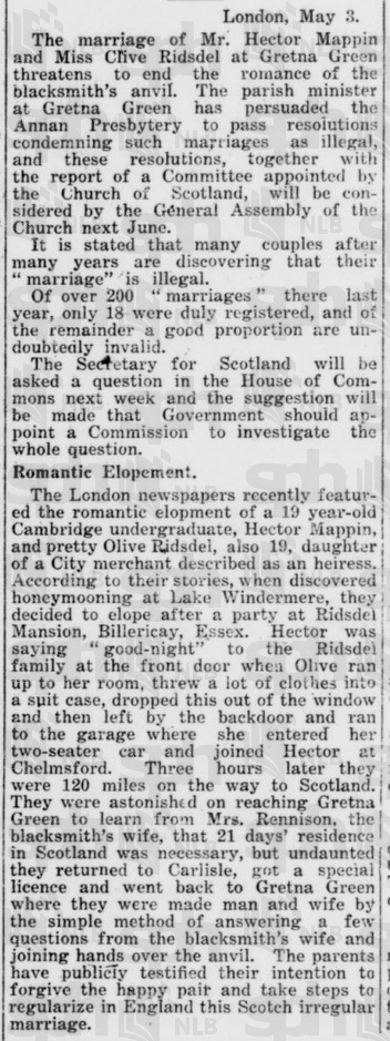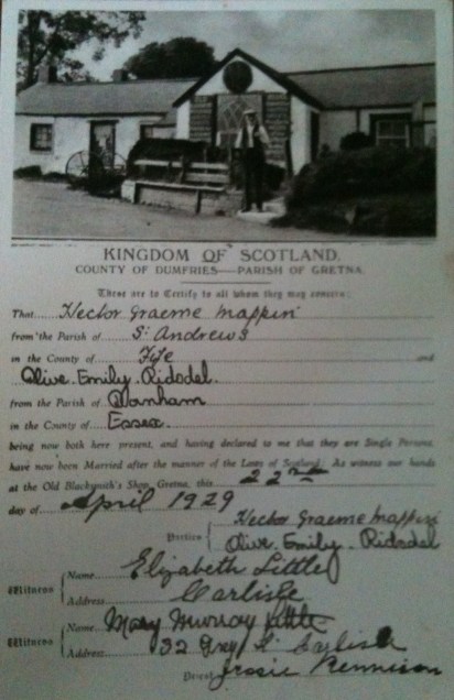 A search of Ancestry.co.uk revealed that the couple Olive Emily RIDSDEL and Hector Graeme MAPPIN married in Billericay Essex in the June Quarter of 1929. Which implies that the couple married in Scotland at Gretna in April and married again in Essex in England in June of the same year. I say married in Scotland on the basis that this feels a little more than a young romantic gesture as the card indicates witnesses and the name of the priest was completed and is shown to be Jessie Rennison. Was one of the couple, or perhaps both, under age in England, but free to marry in Scotland in April then the individual had a birthday and was then of age to marry in England. Was perhaps Hector in the services and stationed in Scotland? I comment on this because it was quite common for servicemen to marry twice, as they had to have the permission of their commanding officer.