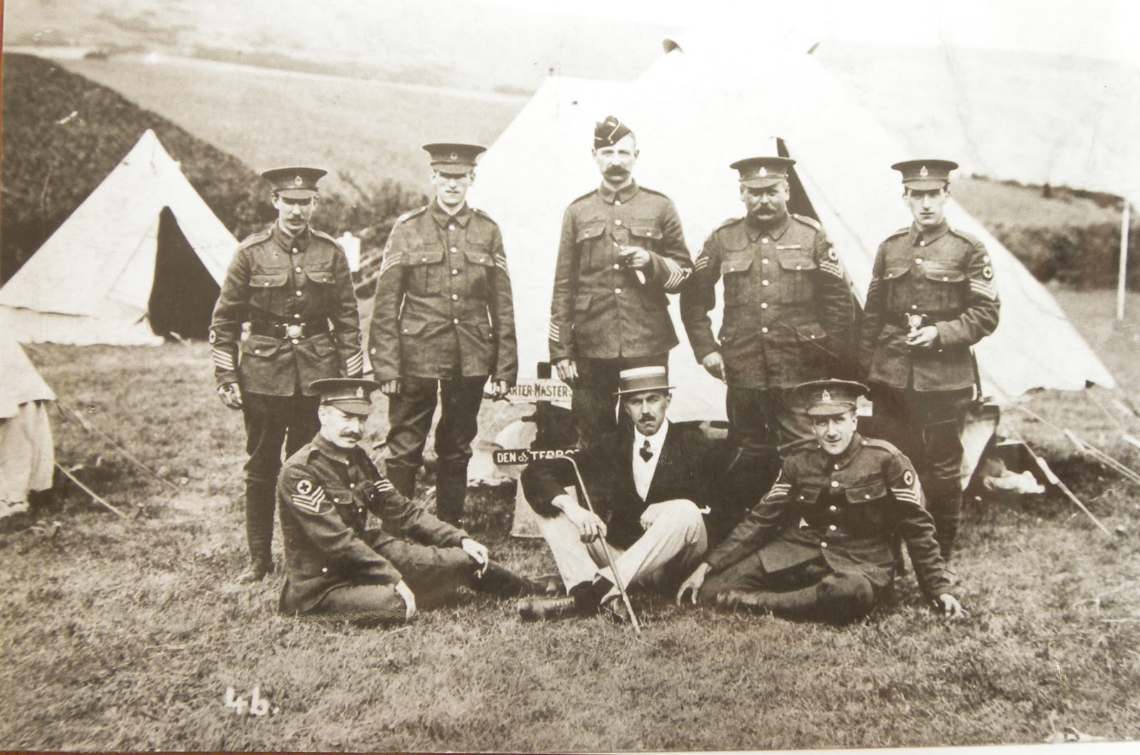 This photo is one from our personal collection. My several times Great Uncle, William Arthur West (1863-1931) stands in the back row, second on the right. This photo was taken during the Boer War. William was already in the Army, serving in the Medical Corp by the time of the Boer War. He joined in 1878 and spent time abroad during the Zulu Wars and the Afghan Wars. His wife accompanied him and died in Zululand in 1894. He remarried to his Cousin in 1897 and they had two children, one of which died in France in 1918. I love the sign “Den of Terror”!