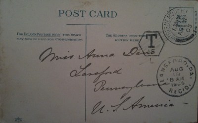The rear stamps show again 1.30pm on Aug 8 1905 with a Bournemouth stamp and shows it arrival in the USA with the stamp of Lansford PA Aug 19 1905 at 8am