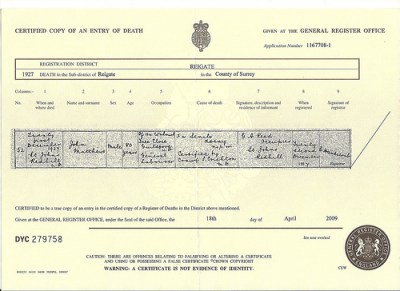 Is that so very different to some 80 year old individuals now? The address where he passed away is not known to the family. There was a brief mention of Redhill, but no family member lived at that address. More research is needed on that point. The address in Guildford is known. It is where my Grandmother lived as a child. The person who registered the death is not known to the family. Did he then die alone?