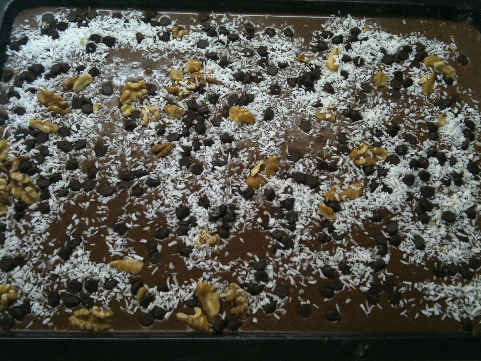 Pour the mixture into a prepared 9 x 13 tray. Lightly greased with a sprinkle of flour and decorate with the choc chips, nuts and coconut you can see in the above picture.