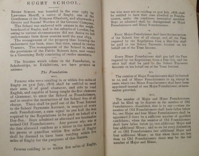 “Persons who were residing in or within a five mile of Rugby on 31st July 1868 shall be entitled to send their sons, if of good character, and be able to read English and capable of being taught the first elements of Grammar, to enter the school as Foundationers and to receive the instruction of the school free of charge”