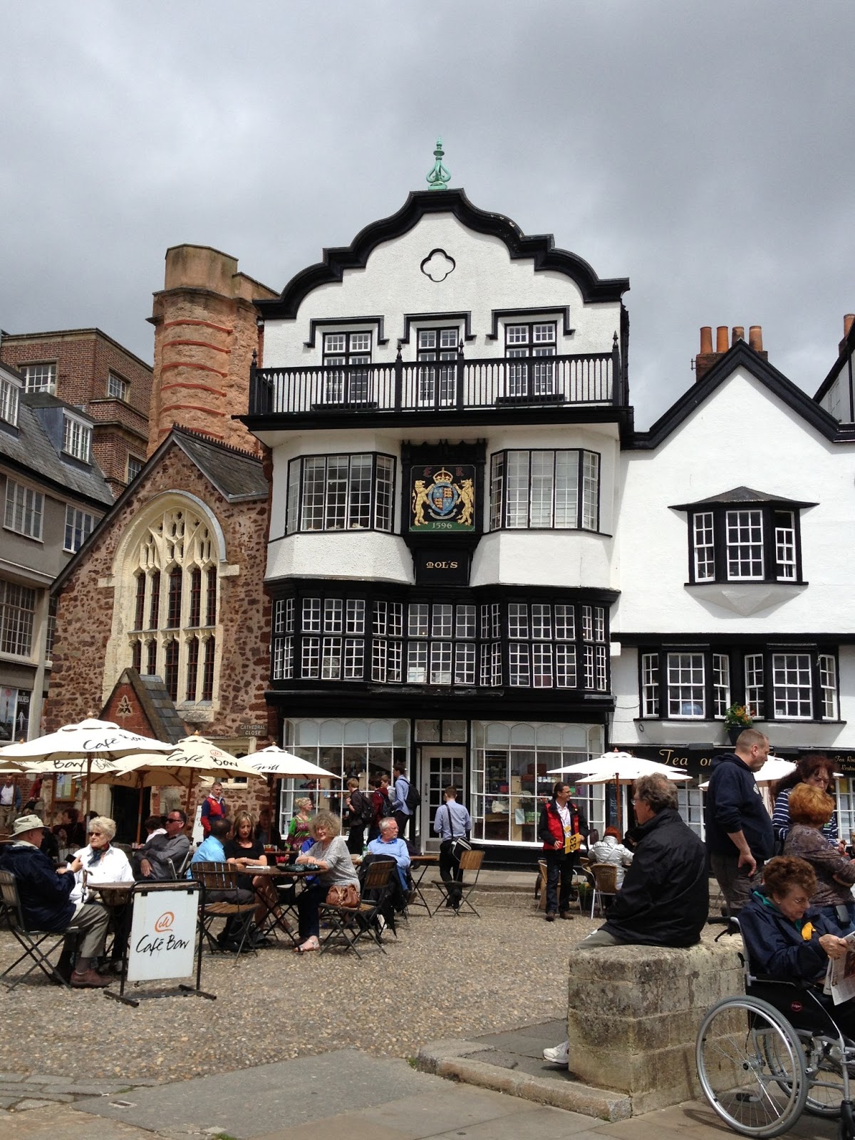 The last photograph here is Mols Coffee Shop which dates from 1596 and despite being a lovely building with lots of Exeter history, it is not the the oldest building in the City. Currently the shop is not a coffee shop, but instead sells rather expensive leather handbags and shoes. Whilst I am rather partial to shoes, somehow I would have been happier if it was a coffee shop selling the wonderful aroma of coffee beans and delightful chocolate and other cakes.