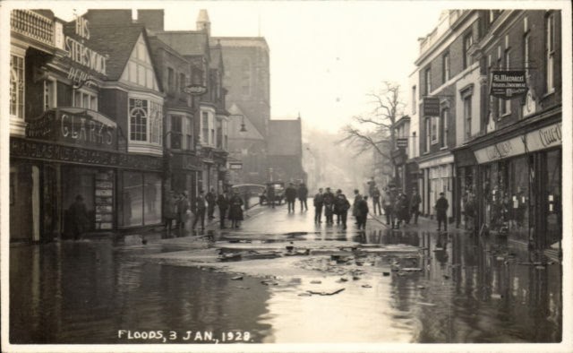 Postcard by D Box. 86 years ago today, this was the view at Guildford. It shows the lower High Street, with St Nicholas Church on the left, looking up to the Mount.