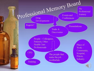Initially I created this, a simple power point slide that looked at the various aspects that I planned to cover on my digital memory board. In this case the memory board reflected my professional career within the pharmacy profession.