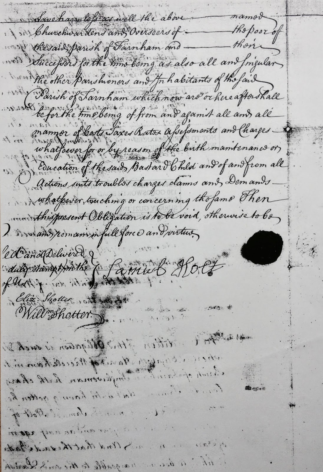 The Bastardy Bond,which you see here was filed on 10th November 1767. Elizabeth clearly names the father as Samuel Holt with the baby being born eighteen months prior.