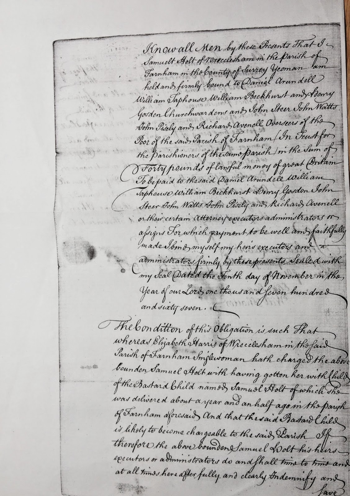 Bastardy Bond Samuel Holt & Elizabeth Harris Surrey History Centre ref 1505/30/1767/BB37 – Page 1 |
