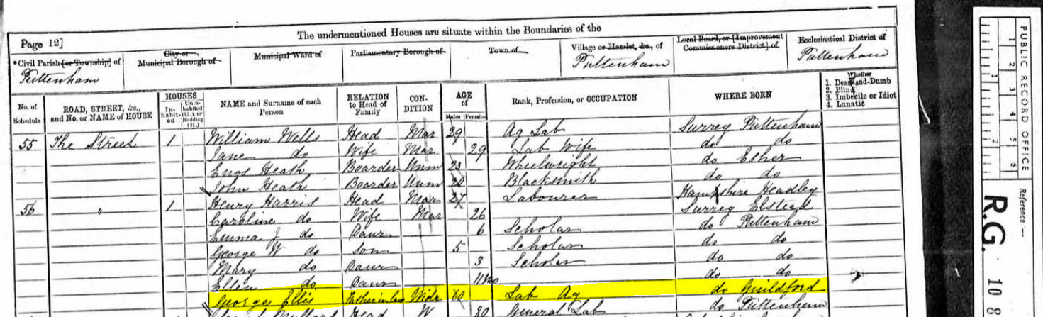 George Ellis (the line in yellow on the image above) has not remarried and is still recorded as a widower. He is aged 60 and working as an agricultural labourer. His place of birth is Guildford in Surrey. He is residing in The Street in Puttenham and in the household of his daughter, Caroline who was born in 1844 and her husband, Henry Harris. They have four children, my late Great grandmother has not yet been born, and would not be for another eight years.
