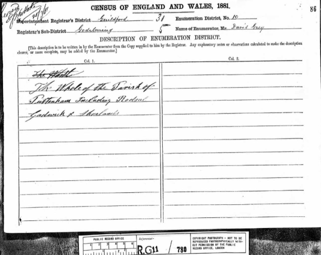 The oldest child, Emma Jane was born to Caroline and Henry before they married, but she was part of the family, considered and loved as such. Emma was aged 17 in 1881. She was a domestic servant, living at Home Farm in Shackleford, which is just a few miles from Puttenham. Home Farm was occupied by Henry Plummer and his wife, and their one year old son, and was a farm of 330 acres, employing 13 labourers and two boys.