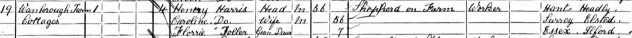 On the next page, we see Henry and Caroline Harris, living with their grand-daughter, Florrie Toller who was aged seven years old, and was the daughter of Henry of Caroline’s daughter, Ellen Harriet. Henry is still working, he is 56 years old and is a shepherd on a farm, likely Manor Farm at Wanborough.