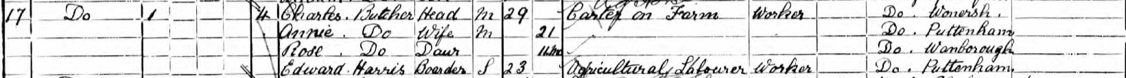 Granny, Annie Prudence is now married to my great Grandfather Charles Butcher, having married on 24 December 1898. They are couple, with their first daughter, my late Aunt Rose who was aged one. Annie was aged 21 and Charles aged 29. Annie was born in Puttenham and Charles in Wonersh, Surrey. Also living with them is Annie’s brother, Edward Harris who was aged 23 and described as an agricultural labourer, Charles is recorded as a carter. The cottage the family were living in was one of Manor Farm Cottages. The family were connected to Manor Farm at Wanborough until 1930.