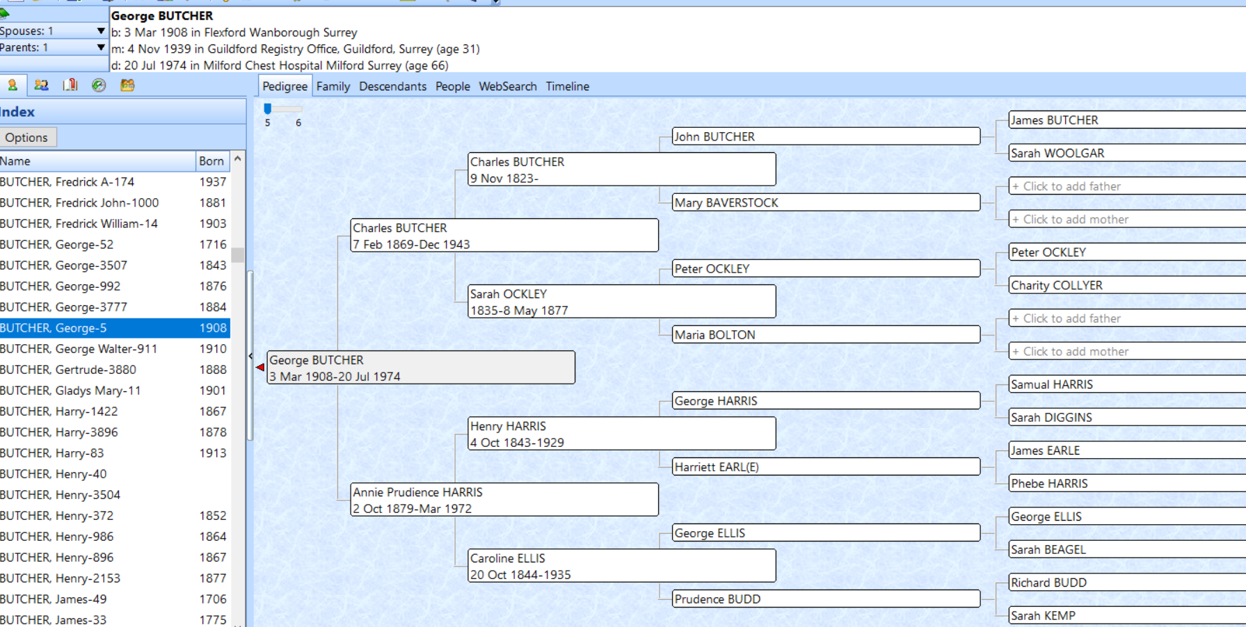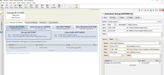I recently began using Family Historian, populated by an extracted GEDCOM from Roots Magic. My maternal Grandfather, George Butcher is individual 5, regardless of the software used. As you can see the layout is very different, but still providing the same individual and the same data.