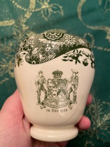 About 20 years ago I purchased this mug from an antique store in Devon. I was drawn to it for several reasons, the colours, the commemorative features and the date – 18 December was the date of my Grandmother’s birthday, though she was born way before 1934.