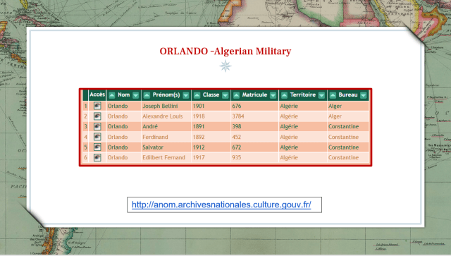 If you look at the red oblong on the left entry, you can hopefully see that the text is hyperlinked – this goes to Memoire des Hommes website, where I can see the image, free of charge. The surprising thing is, I had already visited the Memoire des Hommes site and did the same search, which revealed zilch! The other interesting thing is that the search results shown here includes an instance where the enlisting soldier’s mother has the birth surname of Orlando.