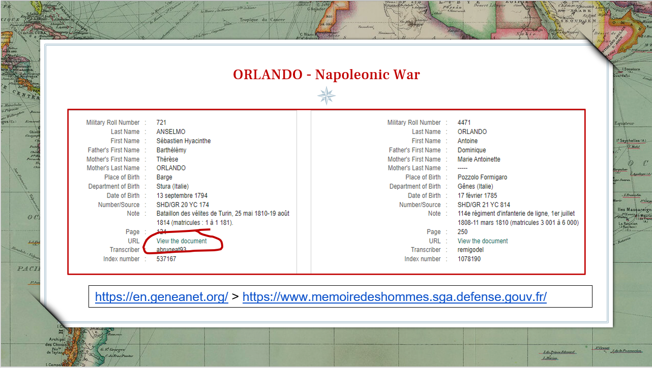 The first search I did was for the Napoleonic War – This database. The site is that of a collaboration and there were two instances of the surname Orlando in the database, as shown below: