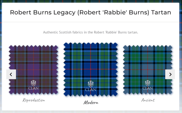 I couldn’t write about Burns Night, or a Scottish surname without writing about Clans and Tartans, even if it is in a limited way. Upon searching the site, Clans.com for the surname BURNS, it revealed 11 such tartans. Each tartan subsequently identified three different pallets – Reproduction, Modern and Ancient. Upon selecting one of the Tartans, Robert Burns Legacy (Robert ‘Rabbie’ Burns) Tartan you can see the slight variation to the colour in the image below.